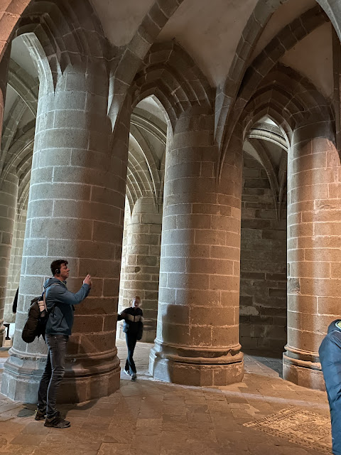 Our first stop was inside the abbey itself. Our guide explained that the abbey was a major site of pilgrimage and the pilgrims would brave the rising tides, quicksand and other dangers in order to approach the abbey. When they arrived they were greeted by the high walls atop the higher cliffs - quite an imposing sight. The granite used to build the abbey was mined on the Channel Islands (Jersey and Guernsey) and shipped to the island.